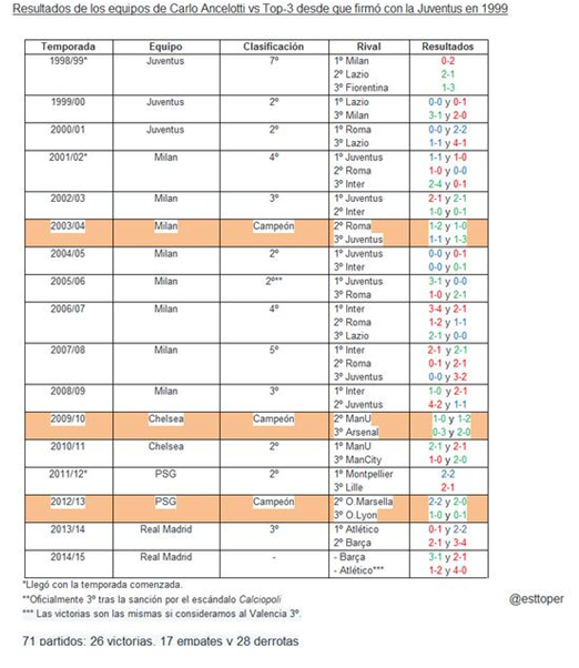 Para ver de forma más completa los «logros» de Ancelotti contra rivales de entidad en su paso por las grandes ligas, adjunto esta recopilación realizada por Alberto Egea (@esttoper en twitter).