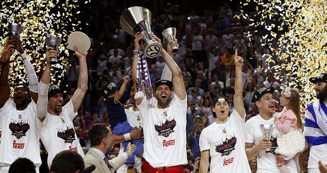 El Real Madrid vuelve a ser el Rey de Europa tras ganar su novena Copa de Europa al Olympiacos por 78-59.El Madrid ganó tras un gran partido en el Palacio,liderados por Carroll (16 puntos) y el MVP de la Final Four,Andrés Nocioni con 12 puntos,7 rebotes,18 de valoración y una enorme entrega y corazón.Los de Pablo Laso fueron muy superiores a Olympiacos desde el inicio del partido,empezaron muy fuerte (6-1) gracias a Felipe y Carroll pero gracias a la intensa defensa de los griegos y a Lojeski se fueron por delante en el marcador en el primer cuarto (15-19).