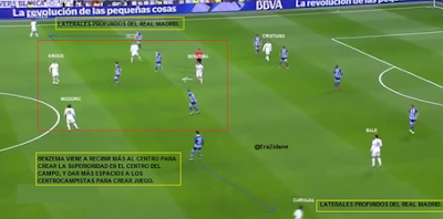 Benzema se viene a ofrecerse al centro del campo, creando superioridad y dando más espacios a los centrocampistas para crear juego, así comienza la jugada del 2-0 para el gol de Bale.