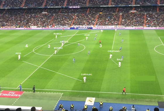 En jugadas laterales, la BBC se cierra en el área para buscar el remate, así creando superioridad a los 2 centrales del equipo rival. Así da lugar el gol de Bale para el 2-0 .