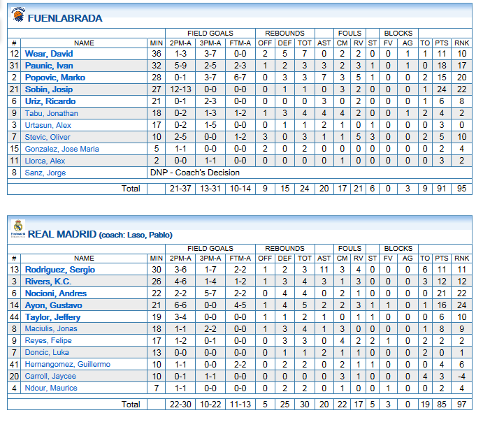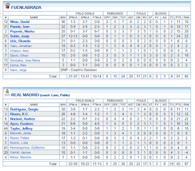 + VICTORIA CON ESTILO. El run and gun fuenlabreño, tienen poco juego interior, y lo basan todo en su línea exterior. 19 triples lanzados en la primera parte, 31 al final del partido. Eso sí, no han dudado en aprovechar las rebajas permanentes que siempre ofrece la zona del Real Madrid, y han sabido buscar a Sobin, para tener más variedad en sus ataques.