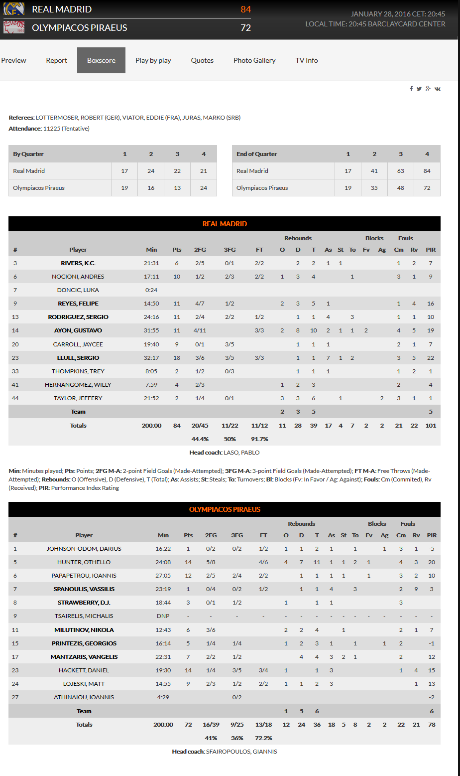 Convincente e importante victoria del Real Madrid sobre Olympiakos por 84-72, en la quinta jornada del Top-16. El trío Sergio Rodríguez, Llull y Ayón fueron los más destacados en un equipo que, por momentos, volvió a recuperar algunas de sus señas de identidad, como la defensa y el control del ritmo del juego. Los griegos suman su tercera derrota consecutiva en Europa, y reducen al mínimo su margen de error.