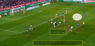 Cuando el balón llegaba a los laterales y llegaban para el centro, el tridente (James-Cristiano y Benzema) y incorporaciones en 2ª línea (Isco) llegaban para el remate.