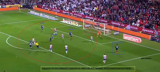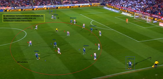 El Granada tapaba los pases interiores con los centrocampistas y los extremos (Success y Peñaranda), por lo que Zidane tuvo que adelantar a los laterales como extremos y cerrar a las bandas. De este modo, los centrocampistas mandaban pases en profundidad a los laterales para crear ocasiones.