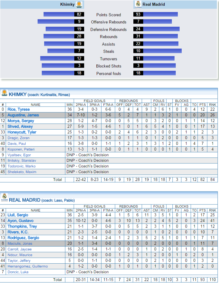 Solo transcurridos un minuto y cuarenta segunda del último parcial, Kurtinaitis pidió tiempo muerto. La leyenda lituana, intuyó que el partido se le iba, y por más que grito a sus jugadores, no pudo evitarlo. Como otras tantas veces, como casi siempre, el mejor juego del Real Madrid vinó a partir de la defensa. Con Shved secado, Augustine sin encontrar tantas facilidades, a destacar en esto el papel de N’dour, y con un Sergio Rodríguez, al que ahora sí, le llegó la inspiración, los blancos, con Ayón como estilete, pusieron la directa hacia la victoria. Khimki desaparecido. 72-82 a cinco minutos del final. Chacho y Llull empezaron a jugar posesiones más largas, y solo Monia, con un triple que ponía el 79-85, inquieto mínimamente, un triunfo más que merecido, que Llull abrochó con otra de sus “mandarinas”, 79-91. Final, una buena renta para el average particular, 82-93.