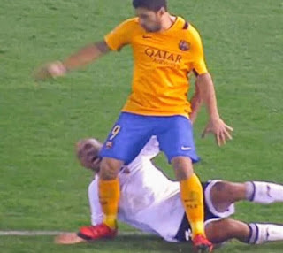 F.C. Barcelona 6-Ath. Bilbao 0: En el minuto 3 falta de Suárez no pitada que acaba en penalti a favor del Barça, con exageración de Suárez (aunque sí es penalti) y finaliza con una roja que sería, tirando de reglamento, amarilla. A lo tonto el Barça lleva un +10 en penaltis. Ni uno en contra. Espero que salgan aquellos de «no se puede el árbitro cargar un partido en el minuto 3». Esperaré sentado.