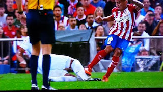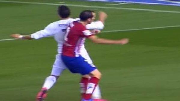Atlético 1-Real Madrid 1: Muchas cosas que decir. Ya sospechábamos de Undiano Mallenco y no nos ha «defraudado». Permitió excesiva dureza por parte de los jugadores del Atlético mientras sancionaba con faltas y tarjetas acciones que no lo eran por parte del Madrid (la de Varane y la de Casemiro en concreto, además este último dejaba en un claro 2 contra 1). Esta falta de criterio produjo situaciones algo «extrañas». Pudo expulsar a Griezman, a Godín y a Correa, pero al final las infracciones, las manos, los cortes de contra-ataques se sucedían sin que pasara nada. También perdonó un (para mi) claro penalti de Godín a CR7 con el marcador 1-1. Como podéis ver en la foto, Godín se desentiende del balón (ni lo mira) y clava su hombro/codo en la espalda de CR7 para que no pueda continuar. Si eso es una carga (se supone que hombro con hombro sin despegar el brazo en la disputa de un balón) entonces yo ya me he vuelto loco. También vemos la fea entrada de Correa a Casemiro en la primera parte (foto de abajo) que ni siquiera fue tarjeta amarilla. Pocos minutos después, recibió tarjeta con lo que en esta entrada, siendo simple amarilla (que para mi es ROJA DIRECTA) hubiera sido expulsado en la primera parte. Igual alguien dice que el árbitro no lo vio… Así que con tres posibles expulsiones y el penalty a CR mi conclusión es que Undiano nos impide llevarnos los 3 puntos.