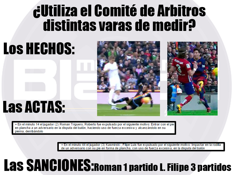 F.C. Barcelona 2-Atlético 1: Ojo, que la expulsión por roja directa lo es. Otra cosa es que en otros partidos no lo es. Y lo más delirante es el acta, os pongo un documento extraordinario. La expulsión del jugador del Rayo por entrada a Kroos. Las actas casi copiadas. A uno 3 partidos y a otro 1.