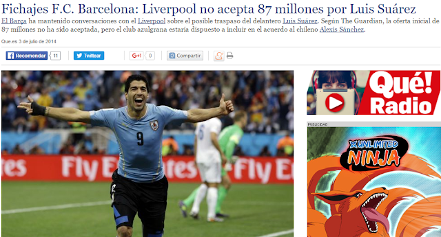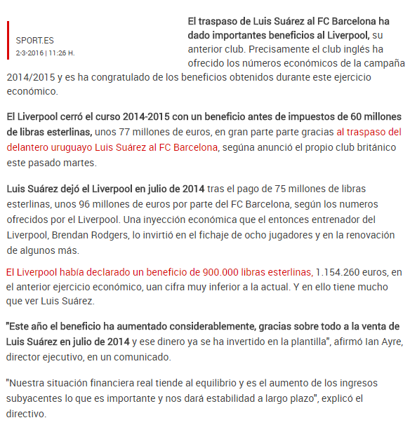 Ojo que llegamos a la mejor parte. Y es que @MaketoLari desveló en Twitter un curioso artículo escrito en el Sport. Se trata de una noticia del Liverpool y lo contentos que están con los beneficios obtenidos. El club británico habría obtenido 96 millones de euros por la venta de Luis Suárez. Si, en Sport se hacen eco de esta noticia que les deja con el culo al aire.