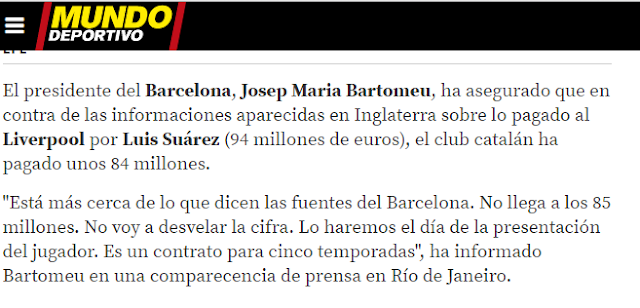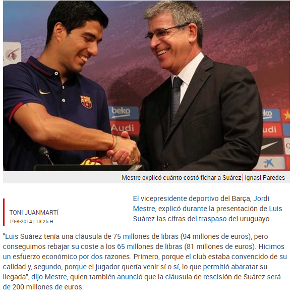 La historia comienza a ponerse emocionante. Finalmente el Barça ficha a Luis Suárez por 96 millones, como veremos después. Pero, ¿cómo el equipo de la cantera va a decir que ha fichado al jugador más caro (Neymar) y al segundo jugador más caro (Suárez)? Era complicado y entonces el Vicepresidente dijo en rueda de prensa que había costado 81 millones. Qué habían hecho negociaciones.