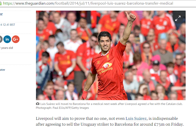 Bien, esta es la información de The Guardian. Dicen que el Liverpool ganó 94 millones de euros, 75 millones de libras por el traspaso de Luis Suárez. Dicen que alrededor, ya que habría alguna clausula que subiría el precio del montante.