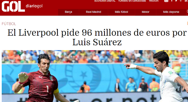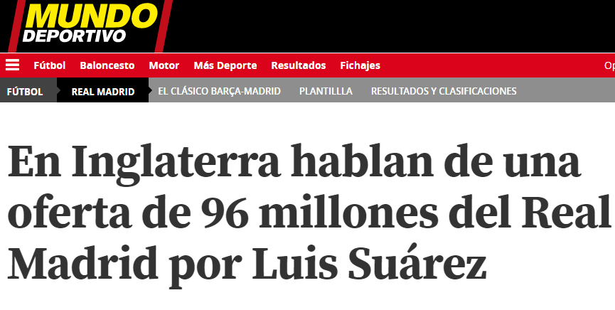 El Real Madrid se presentó ante las oficinas del Liverpool para tantear el fichaje de Luis Suárez. La respuesta fue que se remitían a la clausula de 96 millones. Fue entonces cuando Florentino Pérez dijo la famosa frase de que Luis Suárez no era buen jugador. Quizás el mandatario vio excesiva esa cifra. En Mundo Deportivo se inventaron que el Madrid habría ofrecido 96 millones, cuando en realidad es que esa era la clausula del jugador. Todos los diarios dieron la noticia de que el Liverpool se remitiría a la clausula.
