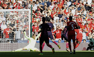 Goleada contundente del Liverpool con un juego ofensivo y vistoso frente a un Barcelona que fue una miniatura, con un Messi y Suárez tan desaparecidos como del Premio al Mejor Jugador de Europa. Y es que el Liverpool comenzó mandando desde el principio y marcó al cuarto de hora. Mané culminó una contra brutal entre Lallana y Fimino. Messi solo apareció poco después para disparar contra el palo y luego no volvió ni a verse su melena rubia plateada, ni a Suárez que lo único que hizo fue disparar contra el muñeco cuando tenía todo para marcar. Saltó un aspersor que nos recordó a la noche mágica de Mourinho con el Inter, y los jugadores tras el descanso. Pero el Barça sufrió nada más comenzar la segunda parte el segundo mazazo. Henderson puso tierra de por medio rematando una jugada por banda de Origi. Y es que el Barça encajó los 4 goles por pérdidas de balón en su campo. Origi al minuto del anterior gol cogió la espalda de la zaga y puso el tercero. Grujic al final cerraría la cuenta con un magnífico cabezazo.