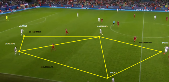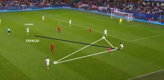 Triángulos posicional del Madrid en la salida de balón con supeioridad numérica.