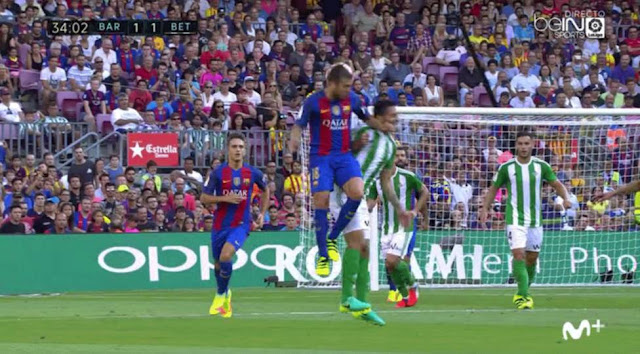 Sin querer afirmar en modo alguno que el arbitraje hubiese tenido nada que ver en el resultado final, sin ir más lejos, durante el Barça-Betis se produjo un codazo bastante feo de Jordi Alba sobre el rostro del bético Petros, que mereció sin duda la tarjeta roja (o al menos una amarilla) pero que Undiano Mallenco dejó sin señalar.