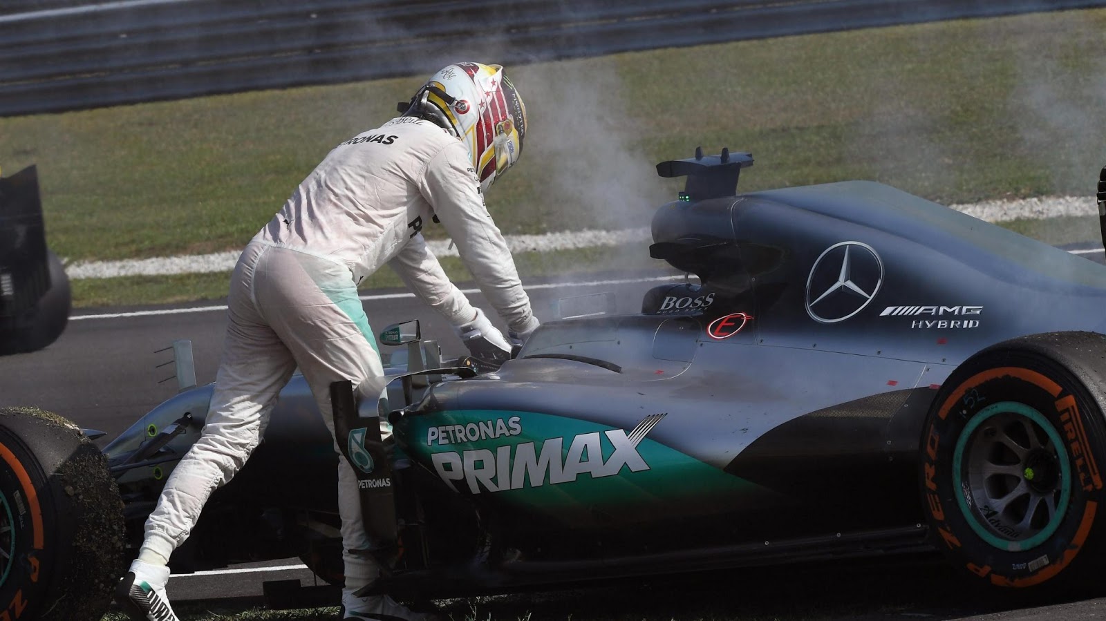 El motor de Hamilton ardía a falta de 15 vueltas para el final cuando lideraba con paso firme la carrera, dejándole fuera de combate en el peor momento del año.