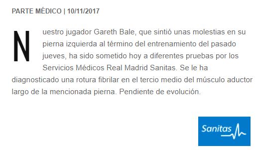 Aunque el parte médico publicado en la web del club blanco se limita a indicar que estará «pendiente de evolución», según lo vivido en otras lesiones similares, se estima que esta nueva dolencia dejará fuera de combate al «Expreso de Cardiff» por un plazo de tiempo no inferior a un mes.
