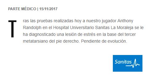 No es la primera vez que Randolph cae lesionado esta misma temporada ya que, nada más comenzar la temporada, estuvo de baja durante casi un mes debido a una luxación en su hombro derecho y para cuya recuperación, el norteamericano tuvo que forzar, habida cuenta la plaga de lesiones que estaba azotando al equipo blanco.