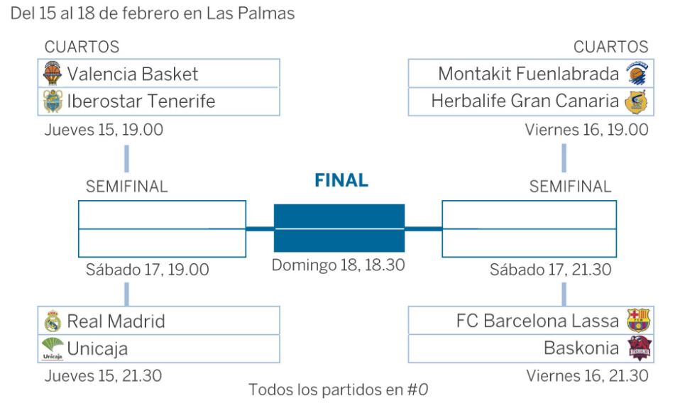 En caso de clasificarse para las semifinales, los chicos de Laso se medirían el sábado 17 a las 19:00 horas al vencedor de la eliminatoria entre Valencia Basket e Iberostar Tenerife.