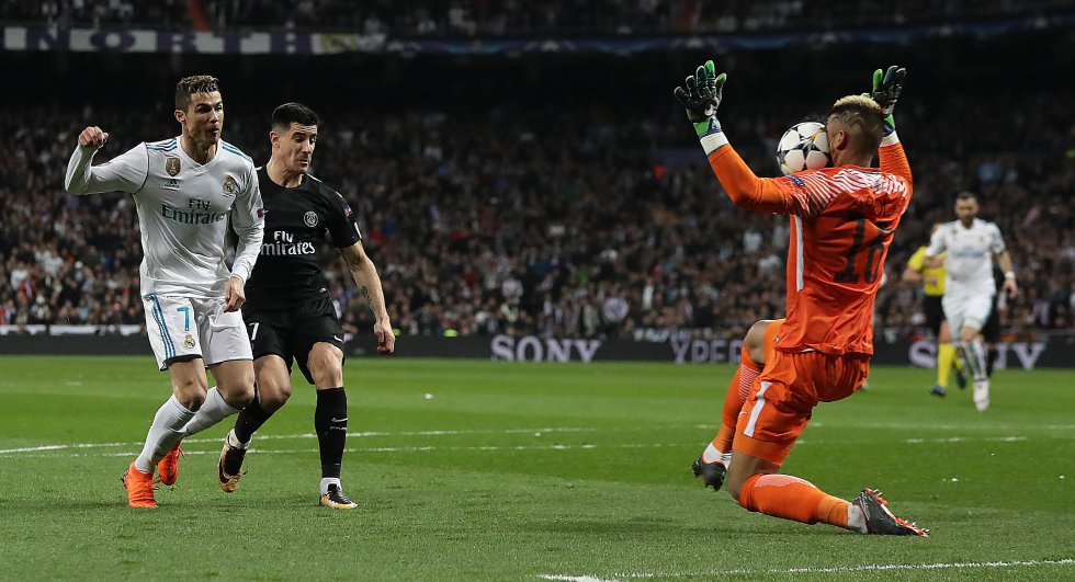 Lejos de arredrarse, el Madrid dispuso de la mejor oportunidad de la primera mitad. Casi a continuación de la jugada de Neymar, Marcelo vio adelantada a la defensa parisina y se despachó un gran pase a la espalda de Kimpembe y Marquinhos que habilitó a Cristiano Ronaldo para plantarse solo ante Areola. Sin embargo e inexplicablemente, el portugués estrelló el balón contra el rostro del meta argentino, perdiendo un gol que ya se cantaba en la grada.