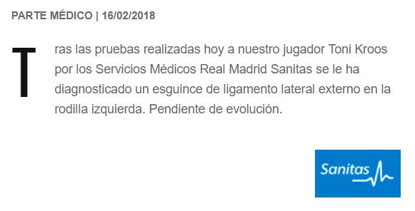 El Real Madrid ha confirmado por medio de un comunicado en su web que su jugador Toni Kroos ha resultado lesionado y será baja de última hora a causa de un esguince en el ligamento lateral externo de su rodilla izquierda.
