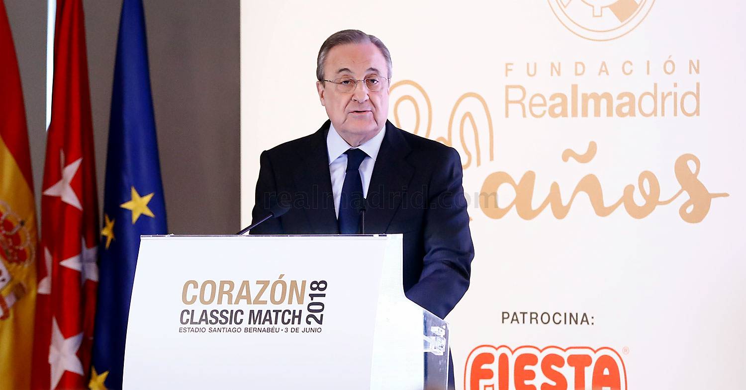 «El Real Madrid y el Arsenal van a protagonizar este Corazón Classic Match 2018 Fútbol por la infancia, cuyos beneficios en esta ocasión se van a destinar a los proyectos de la Fundación Real Madrid que están dirigidos a los niños que más lo necesitan, a los más vulnerables», afirmó el Presidente del club blanco en su discurso.