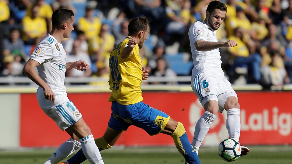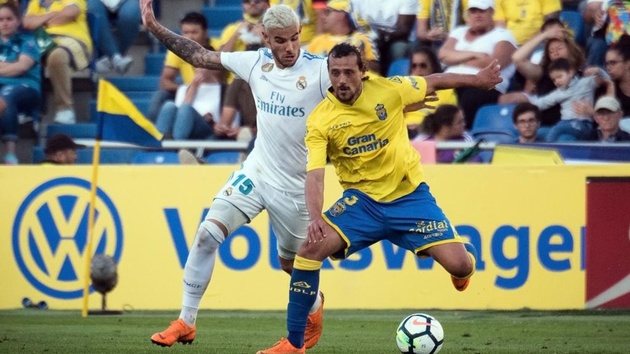 Tras un pequeño susto sufrido por Aquilani, mareado tras un duro balonazo de Bale en su rostro y un codazo feo e innecesario de Ximo Navarro a Theo Hernández que se fue al limbo, el Real Madrid sentenció defintivamente al equipo canario pasada la media hora de partido.