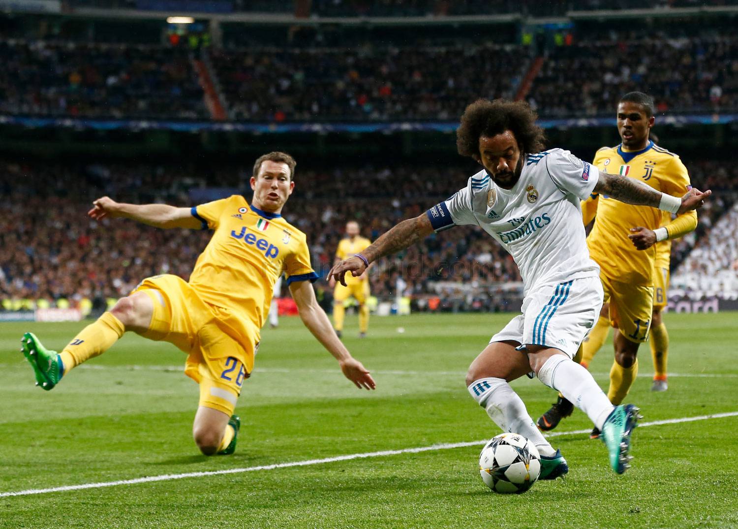 Al filo de la media hora, una falta botada desde la derecha acabó rebotada por la defensa al vértice izquierdo del área de la Juventus y Marcelo remató de volea pero la pelota se fue por encima del larguero.