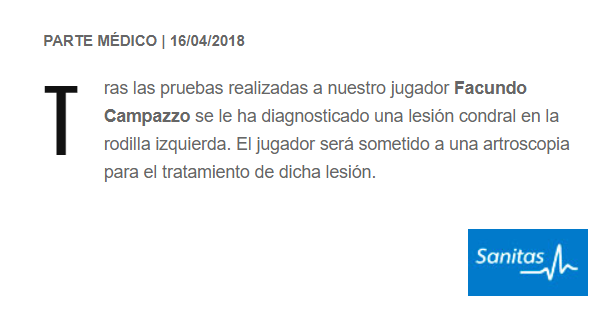Finalmente y, dado que dichas molestias no remitían, Campazzo se sometió hoy a una serie de pruebas diagnósticas en la Clínica Sanitas de La Moraleja, donde se le ha detectado una lesión condal en su rodilla izquierda que deberá ser tratada con artroscopia, según se desprende del parte médico hecho público por el club.