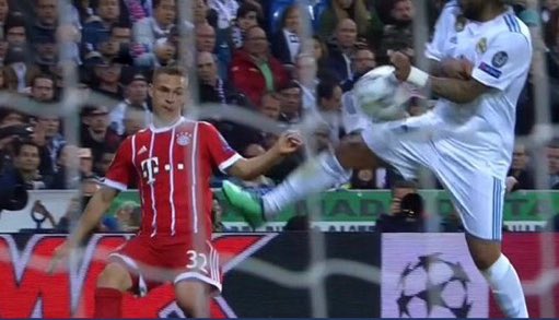 Afortunadamente para el Real Madrid, la jugada fue muy rápida y además Marcelo estuvo muy hábil encogiendo el brazo para que pareciese que la mano había sido involuntaria. Así, ni el colegiado turco ni sus asistentes tuvieron la oportunidad de apreciar la pena máxima, dando por finiquitado el partido en su primera mitada, tras aquella jugada y ante las protestas de James y Kimmich.