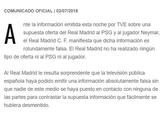 A lo largo del día de hoy, TVE publicó una noticia acerca de un posible interés del Real Madrid por Neymar, según la cual el club blanco habría ofrecido 310 millones de euros al Paris Saint-Germain para hacerse con los servicios del delantero brasileño.