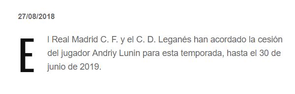 Por tanto, y para que Lunin pueda ir fogueándose en la competición española, el Real Madrid ha atendido las reiteradas peticiones del equipo «pepinero» para hacerse con la cesión del meta ucraniano, que jugará a las órdenes de Mauricio Pellegrino por una temporada y sin opción de compra, tal y como reza el escueto comunicado que acaba de hacer público el club anunciando la operación.
