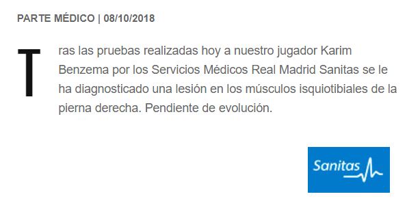 Esto significa que Benzema será baja para los dos próximos compromisos del Real Madrid, a la vuelta del parón de selecciones, esto es, ante el Levante en Liga y el tercer partido de la Fase de Grupos de la Champions League ante el Viktoria Pilzen, ambos en el Santiago Bernabéu y es seria duda para el partido liguero ante el Barça en el Camp Nou el 28 de octubre.