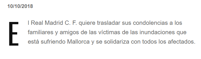 El Real Madrid ha emitido un comunicado en su página web en el que ha mostrado sus condolencias con los afectados en la terrible catástrofe ocurrida el día de ayer en la localidad mallorquina de Sant Llorenç.