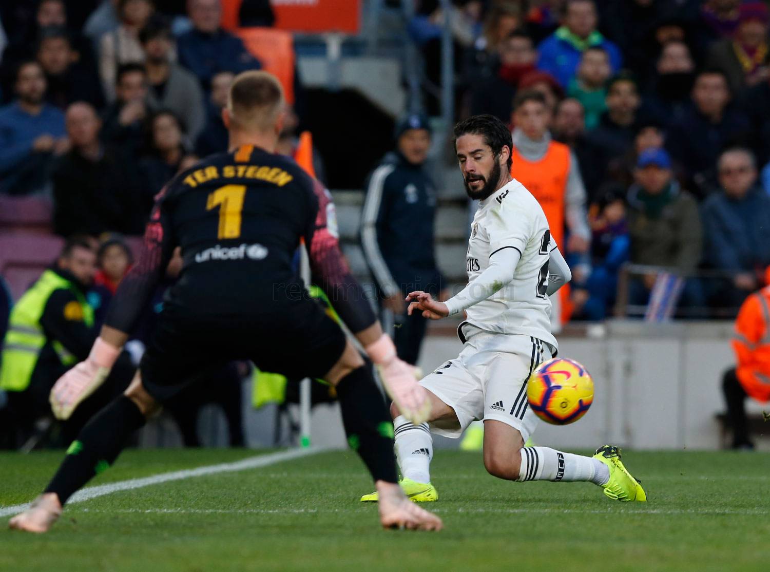 Marcelo: 5. Aprobado. Defensivamente apenas estuvo exigido ya que el Barça centró casi todos sus esfuerzos ofensivos por la banda de Nacho, lo que le permitió incorporarse con alegría al ataque, sobre todo en la segunda parte, en la que fue de lo mejor del equipo. Se lesionó nuevamente y tuvo que dejar el campo antes de tiempo.