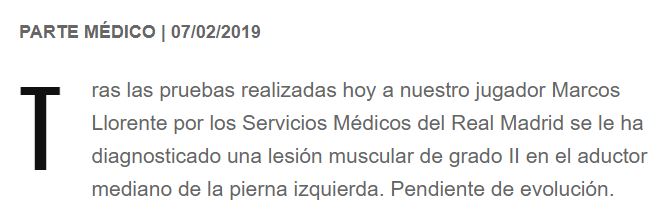 Pues bien, según han arrojado las pruebas a las que se ha sometido Llorente esta mañana en la Clínica Sanitas, los servicios médicos del club le han diagnosticado una «lesión muscular de grado II en el aductor mediano de la pierna izquierda».