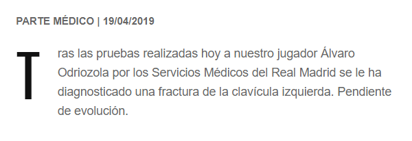 La lesión se ha producido en la sesión de entrenamientos de hoy, viernes, cuando en un choque con Vinicius cayó en mala postura y Odriozola tuvo que ser retirado por las asistencias del club y trasladado de inmediato a la Clínica Sanitas de La Moraleja. Allí fue sometido a una serie de pruebas radiológicas que confirmaron el peor de los presagios y es que el jugador sufría una fractura de la clavícula de su hombro izquierdo.