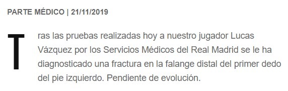 Una lesión absolutamente fortuita y bastante dolorosa que, si bien no va a necesitar que Lucas Vázquez tenga que pasar por el quirófano, sí le dejará fuera de los terrenos de juego en torno a un mes y medio.