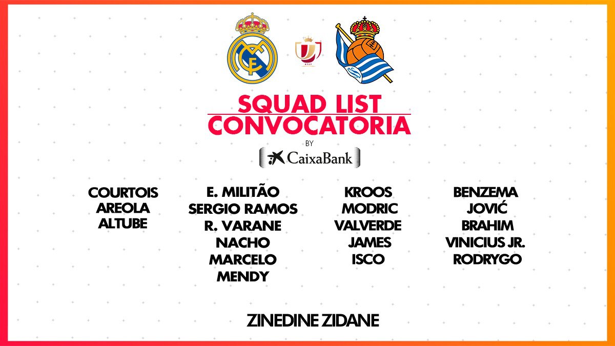 Zinedine Zidane ha confirmado la lista con los 19 jugadores convocados para la disputa del partido de cuartos de final de la Copa del Rey, que enfrentará al Real Madrid con la Real Sociedad en el Santiago Bernabéu (19:00 horas, DAZN)