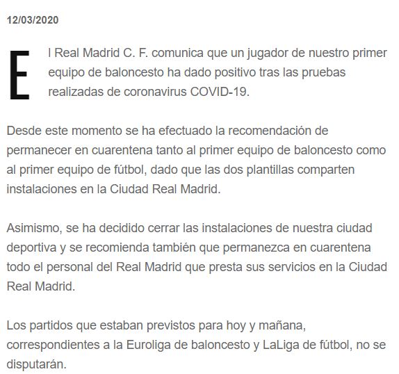 Aunque algunos medios como La Sexta, a través de su periodista José Luis Sánchez, habían venido avisando de la noticia, ha sido el propio club quien, a través de un comunicado oficial ha confirmado la existencia del primer caso de Coronavirus en el Real Madrid, en concreto en su sección de baloncesto.
