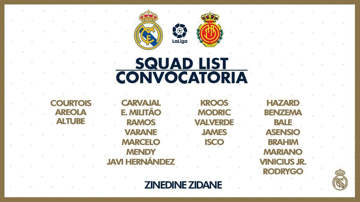 El Real Madrid ha publicado la lista de 23 jugadores que integrarán la convocatoria de Zidane y que se vestirá de corto para el importante partido de hoy ante el Mallorca (22:00 horas, Partidazo Movistar y Audio de RMTV).