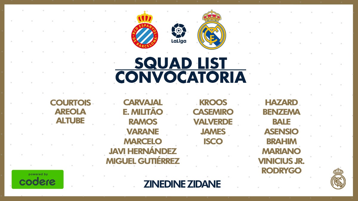 El Real Madrid ha confirmado la lista de 23 jugadores que viajarán a Barcelona para la disputa del encuentro entre el Espanyol y el Real Madrid en el RCDE Stadium (22:00 horas y audio de RMTV)