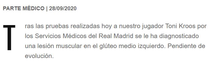 Toni Kroos estará fuera de los terrenos de juego durante un plazo estimado de dos semanas, al confirmarse hoy la existencia de una «lesión muscular en el glúteo medio izquierdo», tal y como reza el comunicado del club hecho público el día de hoy en su web y en sus redes sociales.