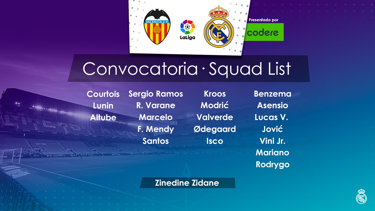 Zidane ha confirmado la lista de 20 jugadores que viajarán a Valencia para la disputa del partido correspondiente a la novena jornada de Liga, que enfrentará en Mestalla al conjunto valencianista y el Real Madrid (21:00 horas, Movistar Partidazo y audio de RMTV).