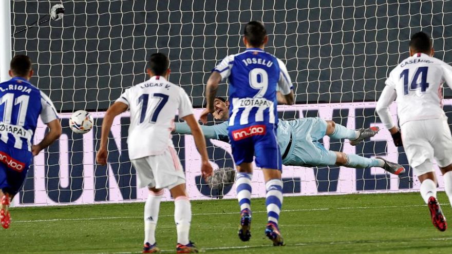 Pero no. A los pocos minutos, Laguardia derribó a Casemiro en el área tras un leve agarrón en el que, claramente, el brasileño exageró la caída. Demasiado poco para pitar penalti, tal vez. Sin embargo, esa misma jugada se repitió en el minuto 15, de nuevo a la salida de otro córner rematado tímidamente por Mariano pero en el que, en paralelo, Laguardia sí agarra con más más fuerza a Casemiro y le derriba de forma más clara, pero la jugada se fue al limbo.