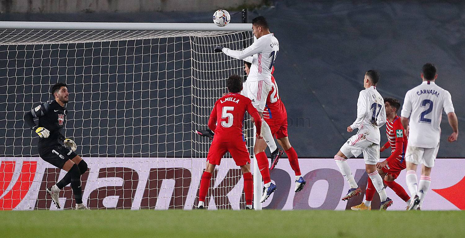 En el rechace del acrobático remate de Asensio, el balón le cayó a Mendy en la izquierda, quien cedió a Kroos. El alemán puso a prueba al meta nazarí con un gran disparo desde la frontal y el balón quedó muerto en el área rojiblanca. Asensio lo aprovechó y centró al corazón del área pequeña pero el remate a bocajarro de Valverde se estrelló en el portero y el posterior rechace le cayó a Benzema, quien libre de marca, remató por encima del larguero.