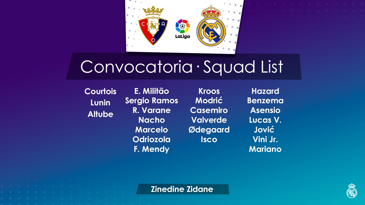 El Real Madrid ha confirmado la lista de 23 jugadores que Zidane ha convocado para la disputa del partido que enfrentará este sábado al Real Madrid contra Osasuna en El Sadar (21:00 horas, Movistar LaLiga y audio de RMTV).