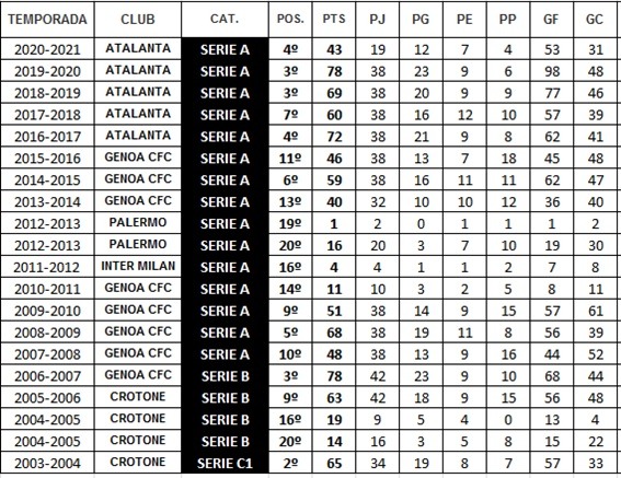 El conjunto nerazurri en la temporada 2016/17 quedó en 4 ° posición (tras Juventus, Roma y Nápoles), la siguiente temporada 2017/18 fue la más floja, el equipo lombardo terminó en 7ª posición en el campeonato italiano. Estas dos últimas temporadas 2018/19 y 2019/20, el Atalanta fue tercero por delante de grandes equipos del calcio italiano, hace dos temporadas el conjunto de la “Dea” (diosa) se coronó por delante de equipos superiores como Inter, Milan, Roma, Torino y Lazio, mientras que la temporada pasada volvió a repetir una gran campaña dejando detrás de ellos a Lazio, Roma, Milan o Napolés.