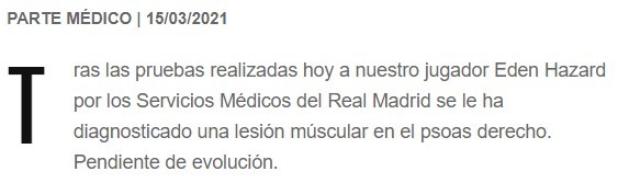 En esta ocasión y, tras el pertinente parte médico hecho público por el club en su web y en las distintas redes sociales, el jugador belga, que sigue sin levantar cabeza, ha sufrido ahora una «lesión múscular en el psoas derecho».