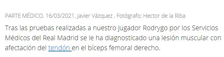 En concreto, según informa el club en el parte médico que ha hecho público en su página web, Rodrygo sufre «una lesión muscular con afectación del tendón en el bíceps femoral derecho».